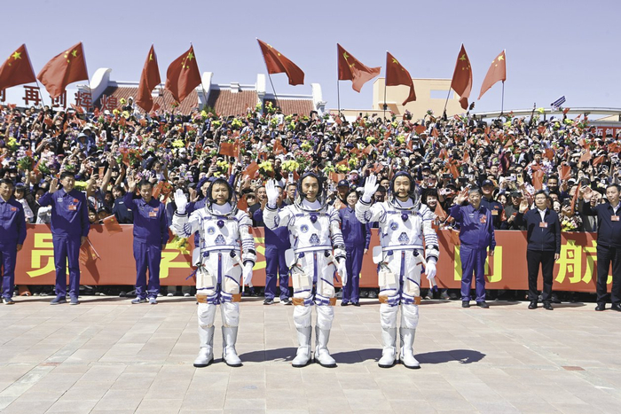 4月24日,神舟二十号载人飞行任务航天员乘组出征仪式在酒泉卫星发射中心问天阁圆梦园广场举行。图为航天员陈冬(右)、陈中瑞(中)、王杰在出征仪式上。 (中新社)