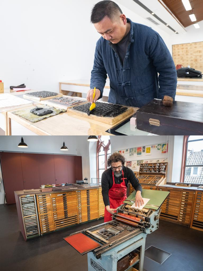 拼版照片:上图为4月2日,胶泥活字非遗传承人汪奎展示覆墨工艺。新华社记者肖艺九摄;下图为3月21日,古登堡博物馆印刷车间经理克里斯托夫·松德尔展示古登堡印刷术工艺。新华社记者张帆摄