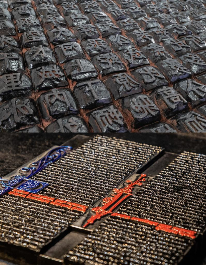 拼版照片:上图为4月2日在湖北省英山县毕昇纪念园拍摄的泥活字。新华社记者肖艺九摄;下图为3月21日在古登堡博物馆拍摄的传统古登堡印刷术雕版。新华社记者张帆摄