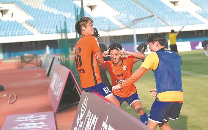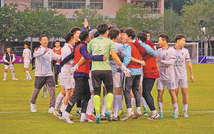 3月16日,泉州职业技术大学足球场,泉州青工走走纺织队在足协杯首轮获胜后,球员聚在一起庆祝。