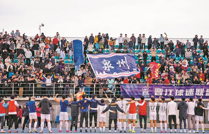 3月16日,泉州职业技术大学足球场,泉州青工走走纺织队在足协杯首轮获胜后,球员和现场球迷互动。