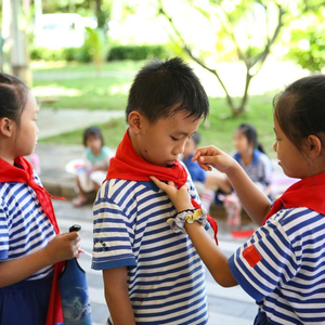 海南省三沙市永兴学校的少先队员们在“童心向祖国,我为祖国献首歌”活动中佩戴红领巾。(资料照片)新华社记者 樊雨晴 摄
