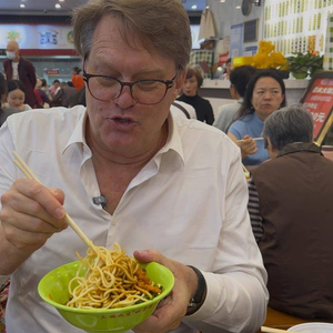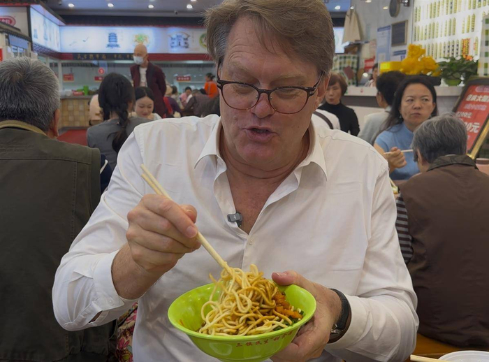 谁能拒绝下班后来一碗热干面?在三镇民生甜食馆,彼得像本地“拐子”一样大方地坐下,熟练地将面前的热干面拌匀,还用筷子夹起裹满浓郁芝麻酱的面条,大呼:“好吃!”