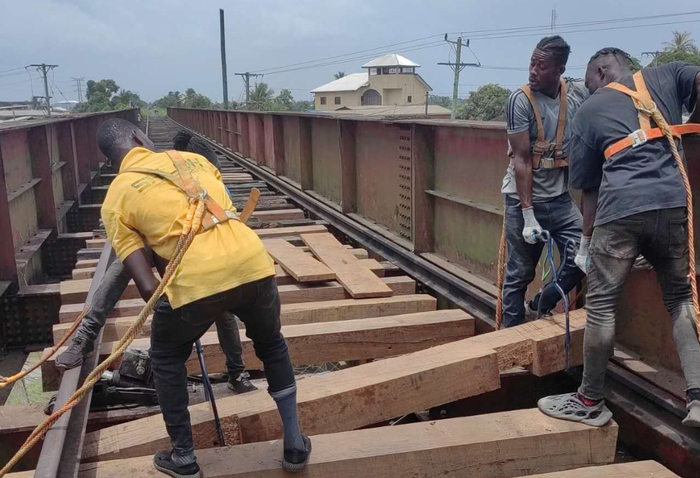 锦华盛利比里亚邦矿铁路项目,当地员工正在更换枕木。