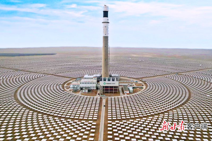 在酒泉市金塔县广袤的戈壁滩上,一座247米的吸热塔直冲云霄。塔周围76.78万平方米的区域内,整齐排列着25594面定日镜。每3至6秒,这些定日镜会自动调整一次角度,将太阳光精准反射到吸热塔上。距离这阵列不远处,是长达数公里、如波浪般连绵起伏的蓝色光伏板。