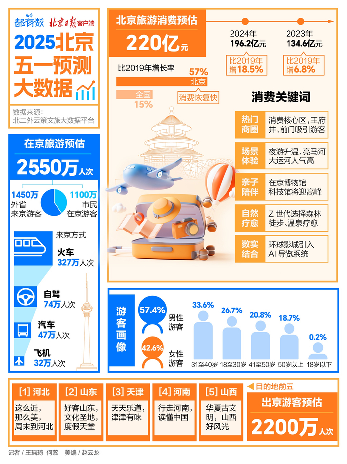 今年五一假期延长至五天,您打算去哪儿?北二外云策文旅大数据平台的预测数据显示,北京旅游人次与消费将有较大增长。北京哪些景区将迎人流新高峰?北京人最爱去哪度假?看数据解读——