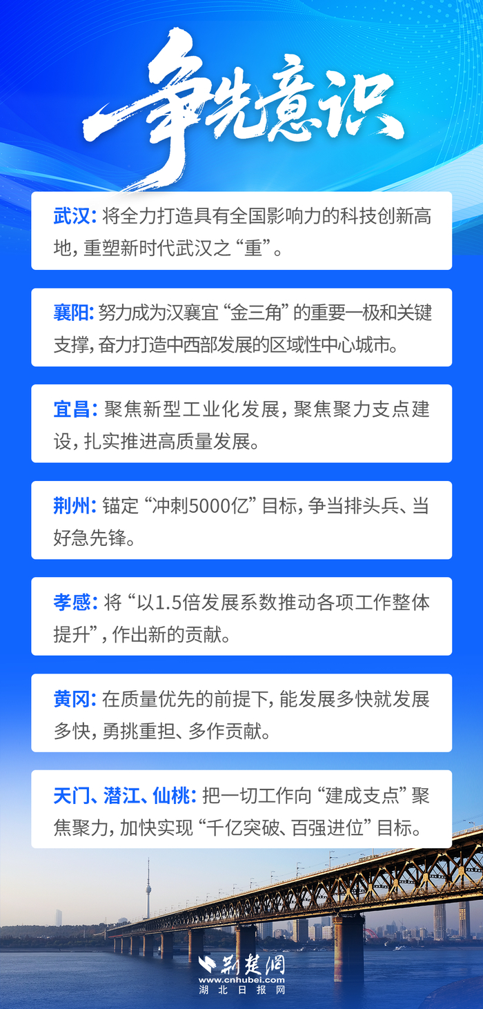 从能级跨越到枢纽提能,从科技创新到产业倍增,从营商环境到绿色发展……湖北各市州围绕加快建成支点,定目标、明方向、聚合力,以只争朝夕、时不我待的紧迫感,推动各项工作往前赶、上台阶。
