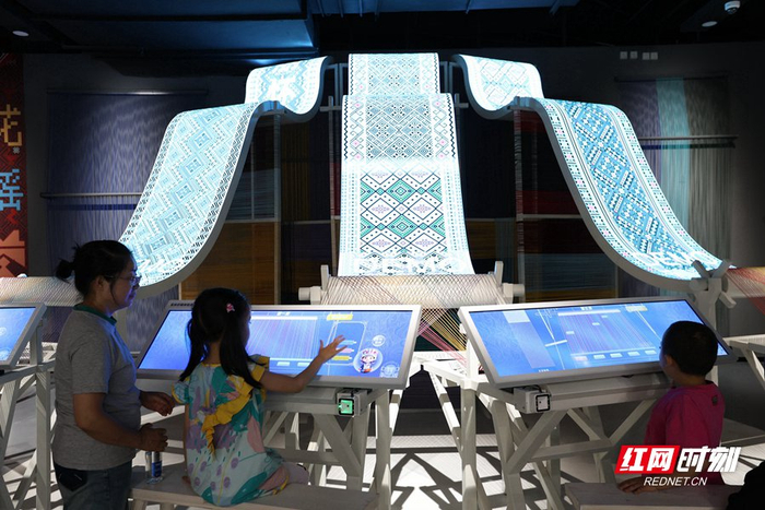 侗锦展区,游客在体验“电子织锦”。