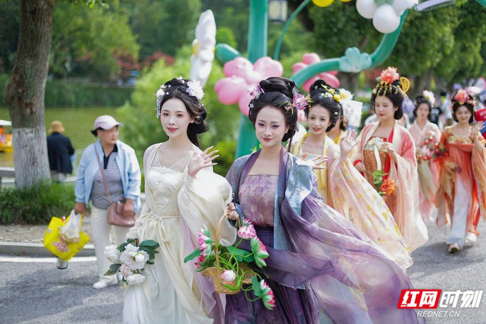 现场工作人员介绍,十二位“花神”既懂传统礼仪,又能与游客亲切互动。传统文化与市井温情的交融交织,让游客在抵达瞬间就能触摸到城市的文化脉搏。“五一”假期,“花神接站”活动将轮番在岳阳东站、君山公园等地举行。