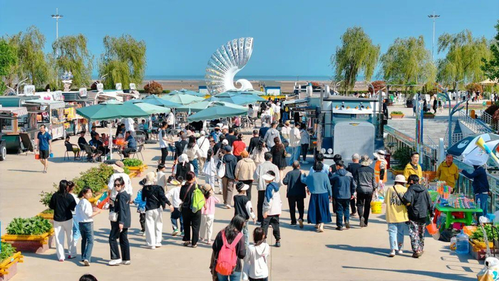 五一假期的刘家湾赶海园,人潮涌动。游客们携亲伴友奔赴而来,欢声笑语与海浪声交织,共同奏响假日的欢快乐章。
