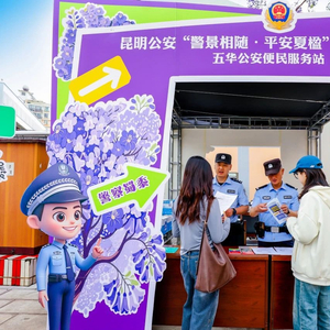 这是守护“有一种叫云南的生活”昆明公安“警景相随·平安夏楹”主题宣传活动中的温馨一幕。“五一”期间,昆明公安将在教场中路持续开展活动,“警察蓝”用实力护航“赏楹季”,惊喜不止警犬哦!