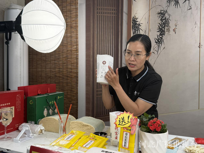 “拿到我家面以后你就看配料表,它的配料表只有小麦粉、水跟食用盐,是没有任何添加剂的……”在石家庄市藁城区青竹宫面文化园直播间,石家庄市传承宫面有限公司厂长步俊英正在镜头前熟练地拿起一根煮好的宫面,双手拉直面条绕了几圈,面条依然弹性十足。伴随着亲切的话语和高品质的产品,直播间持续升温。