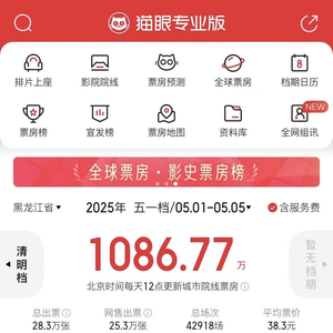 5月6日,根据“猫眼”专业版APP数据,黑龙江2025“五一”电影档(5月1日至5月5日)票房达1086.77万元,总出票28.3万张。其中,电影《水饺皇后》荣登全国票房冠军宝座。