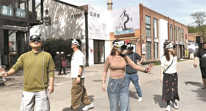 市民游客戴着虚拟现实头显设备,行走在798·751园区内。