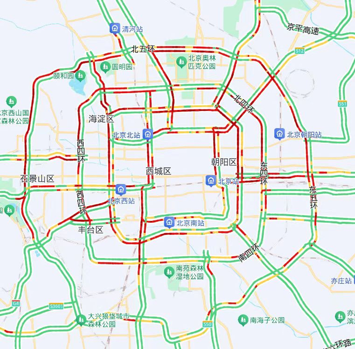晚高峰期间,通勤、休闲、聚会出行集中,城区东西部主要环路北向南方向,北五环双向、北三环北四环西向东方向,京藏、京承、京开、京港澳、京通快速、首都机场高速等高速出城方向部分路段,亮马桥、航天桥、双安、月坛、东直门等区域交通压力较大,莲石东路、通惠河北路、万泉河路、丰体南路等道路局部路段出城方向压力集中。