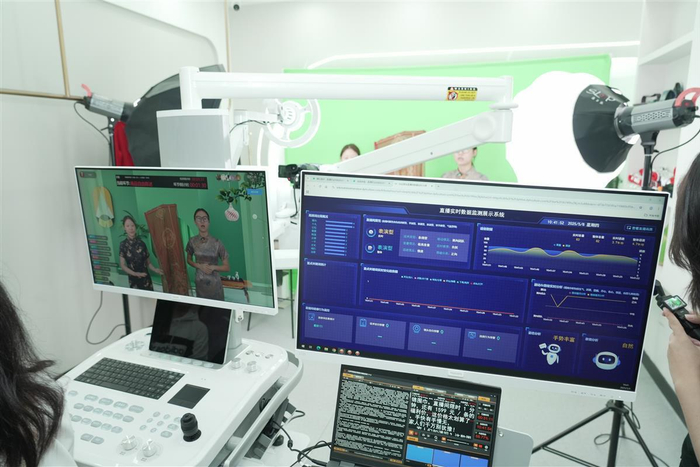 紧邻武汉软件工程职业学院社交电商特色产业学院电梯的屏幕上,有中外主播24小时激情带货——他们是采集了学校学生形象与音色的数字人;转进实训室,学生们正在练习直播,一台AI主播教学评价一体机实时智能分析直播内容,帮学生实时提升直播技能。