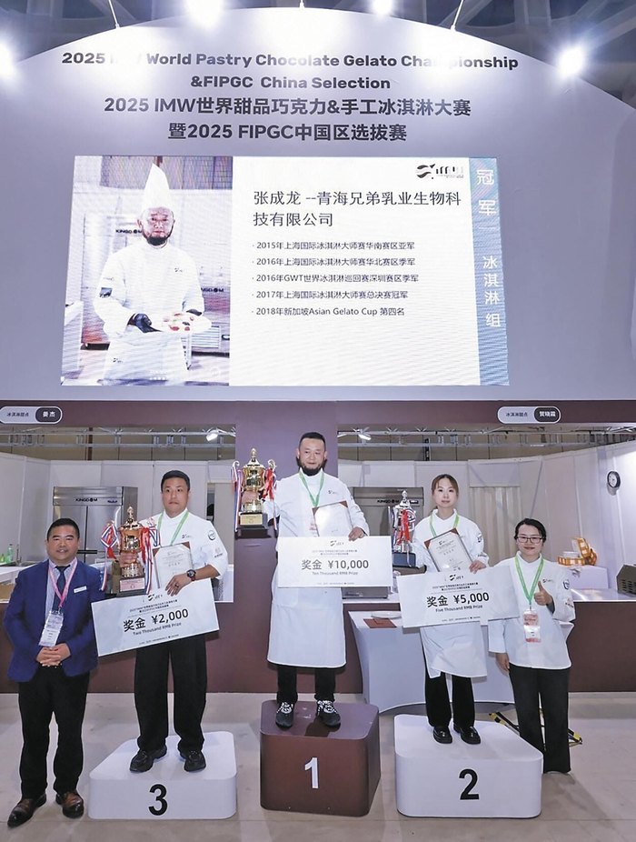 今年4月2日,在上海国际会展中心“2025IMW世界甜品巧克力&手工冰淇淋大赛暨2025意大利FIPGC中国区选拔赛”的舞台上,当主持人念出“Qinghai Hassan Ice Cream”的产品名称时,张成龙双手紧攥,手心沁出了汗。他研发制作的“玫荔覆彩”“雪域冰酥”两款冰淇淋作品斩获本场大赛的冠军,成为首次登顶“甜品界奥林匹克”的中国西北品牌,这也是青海牦牛酸奶、枸杞、藜麦等高原食材,第一次以如此高调的姿态站在世界甜品界的聚光灯下。