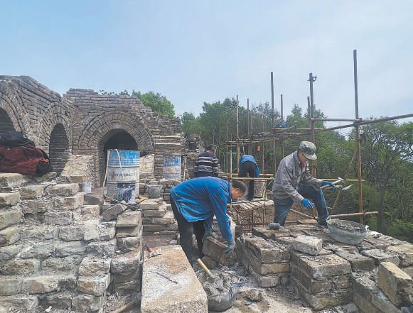 晨光熹微,箭扣长城在燕山山脉的雾霭中若隐若现。施工人员已经开始了一天的忙碌,他们踩着搭在长城墙体旁胳膊粗的脚手架,将一筐筐青灰色城砖用绳索逐块吊运至损坏的垛口处,用刨锛清除旧砖上的残灰,再以灰浆重新灌浆砌筑——箭扣长城修缮五期工程已经进入第二个施工年份。