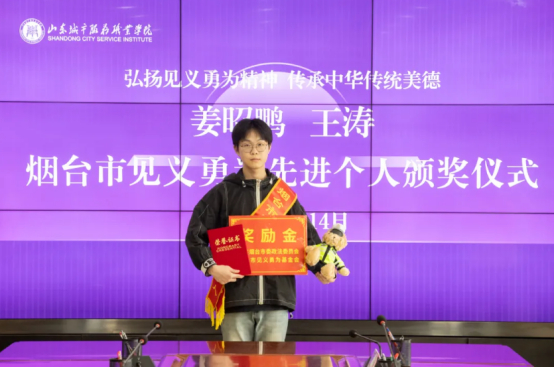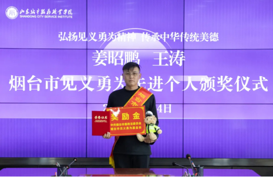5月14日上午,烟台市委政法委、烟台市见义勇为基金会相关人员来到山东城市服务职业学院,授予姜昭鹏、王涛“烟台市见义勇为先进个人”荣誉称号。烟台交警第五大队相关负责人为两人送上“交警小熊”玩偶。