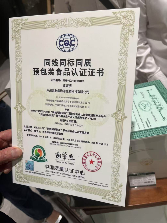 吉利鼎公司出示的“同线同标同质预包装食品认证证书”,发证日期为2025年5月2日。