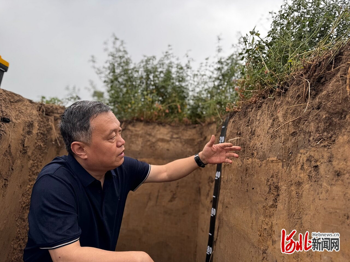 “这个区域属于冲积平原的末端,且曾受到过海侵影响,表层淤积了一层约30厘米的黏土层,30厘米以下一直到110厘米都是砂质壤土,在45厘米—110厘米可以看到不均匀的浅黄色锈斑,这是地下水携带的铁离子运移到这里发生氧化反应形成的铁锈色的沉积物,是盐化潮土典型的特征。这说明这个区域地下水很容易就影响到接近土壤表层的区域。”河北省农林科学院资源环境研究所研究员贾良良站在深坑里,介绍这里的土壤特征。