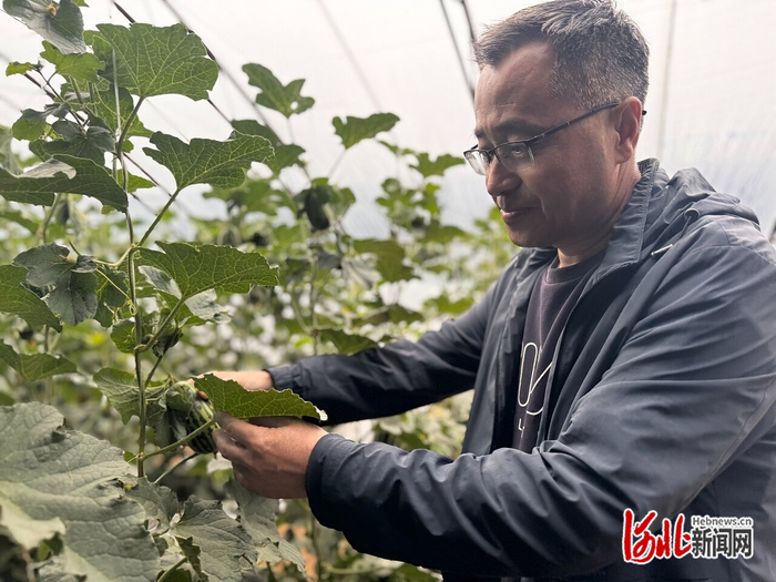 5月9日,沧州渤海新区黄骅市南大港产业园区绿康现代农业园区温室大棚内,河北省农林科学院滨海农业研究所研究员张国新正查看甜瓜长势。河北日报记者白云摄