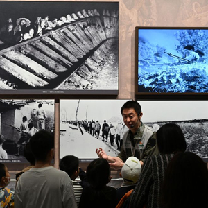 2025年4月6日,观众在中国人民革命军事博物馆听讲解员讲抗战的故事。新华社记者 刘金海 摄