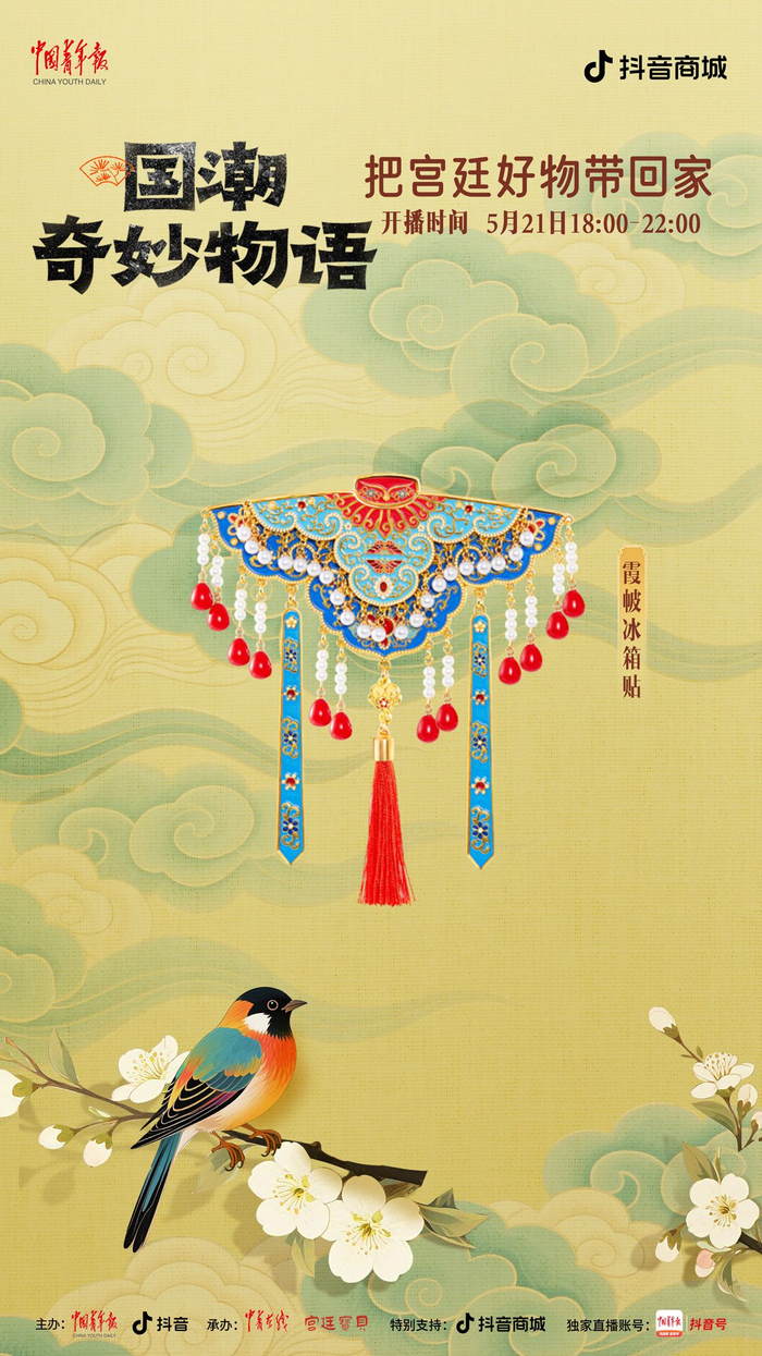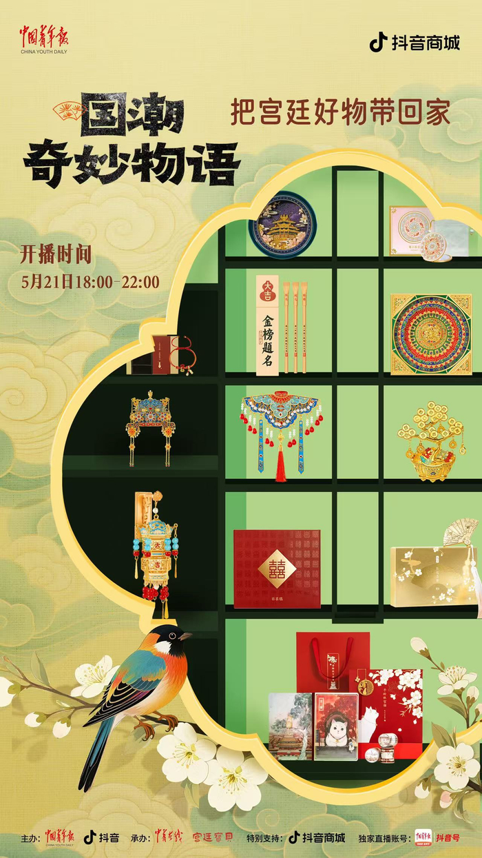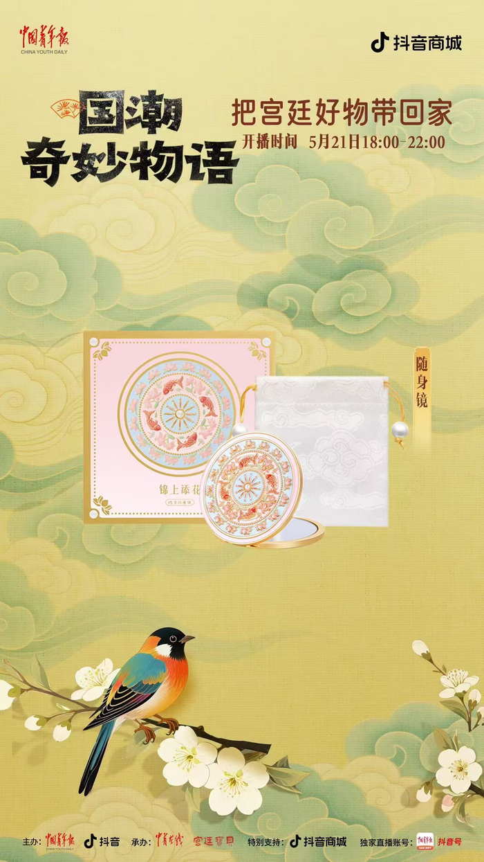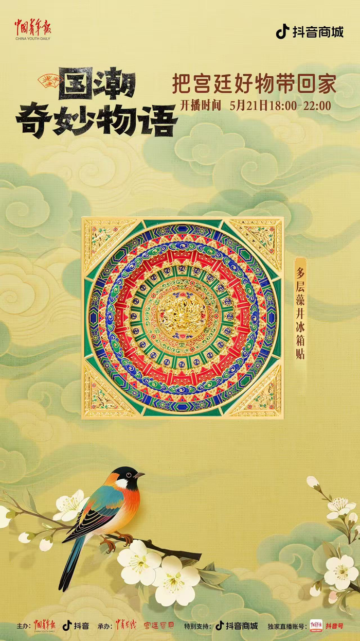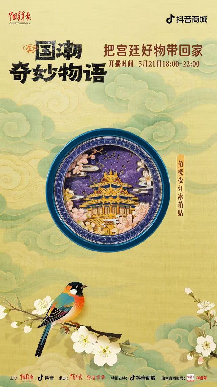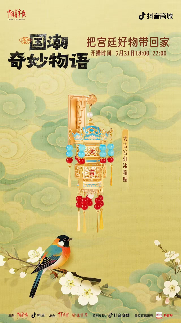 中国青年报客户端讯(中青在线记者 温维娜)5月21日18时至22时,由中国青年报社、抖音主办,中青在线、宫廷宝贝承办的“国潮奇妙物语:把宫廷好物带回家”主题直播,将在中青报客户端抖音号独家开播。本场直播精心挑选了宫灯冰箱贴、随身镜、百喜毯等 20 件文创好物,为观众带来直播间专属超低价格。此外,还有文博馆员和新锐策展人亲临直播间,讲解文创产品背后的历史典故,以及现代创意与传统文化碰撞出的文化新解。