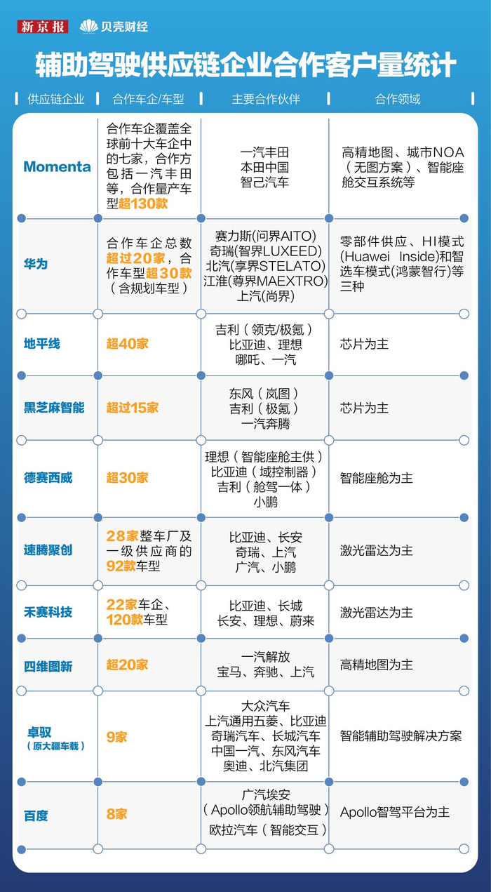新京报贝壳财经记者梳理发现,辅助驾驶供应链企业在客户数量上的竞争呈现出覆盖范围广、合作数量多、客户类型多元化的特点,各企业都在努力扩大自己的客户群体,以在激烈的市场竞争中占据优势。