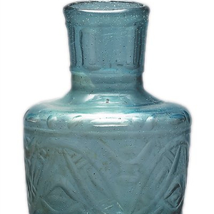 浅蓝色刻花玻璃瓶通体透明光洁,直颈,折肩,筒形腹,平底,颈、腹和底部均有几何花纹。其器形和纹饰均为10世纪伊斯兰玻璃器的流行样式。