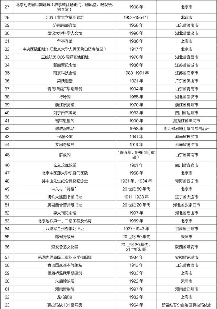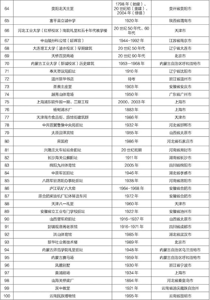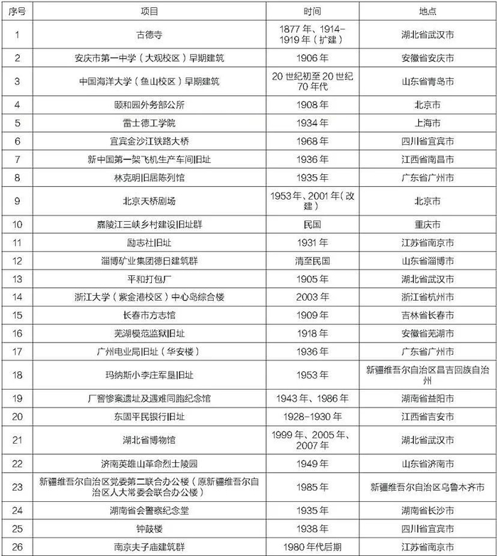 自2016年起,中国文物学会20世纪建筑遗产专业委员会共计向社会推介了十批1000处20世纪建筑遗产。这些项目涵盖文化、教育、工业、交通、科技、军事、办公、医疗、体育、商业、娱乐、居住等十多个门类,已经遍及全国31个省、市、自治区。