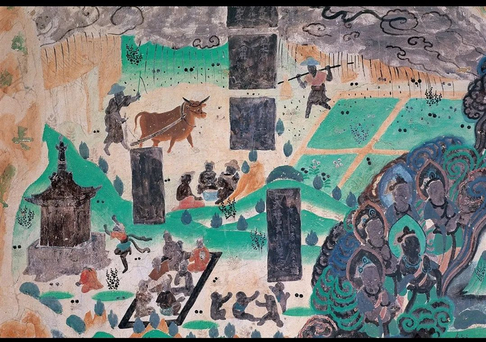 敦煌莫高窟第23窟《雨中耕作与起塔供养》。