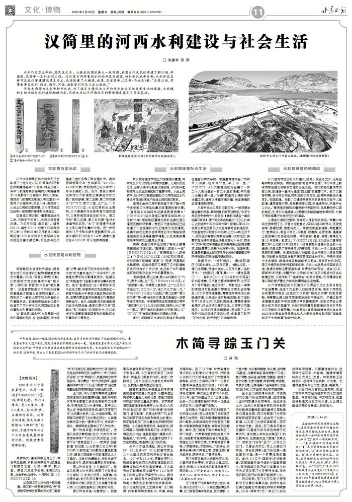 汉代河西地区的水利建设不仅满足了戍边士卒日常生产生活需要、促进了农业和人口的持续发展、维系了河西社会的繁荣与稳定,还完成了汉武帝“断匈奴右臂”的既定策略,保障着丝绸之路河西走廊沿线的平稳运行。尽管这些河流渠道历经数千年滚滚黄沙早已掩埋废弃,但在甘肃出土简牍为数不多的笔墨下,向我们诉说着那段辉煌的历史岁月和大汉王朝的往昔荣耀。(作者单位:甘肃简牍博物馆)(本文系2023年甘肃省宣传思想文化人才原创成果资助项目“简牍里的万千中国故事”阶段性成果。)