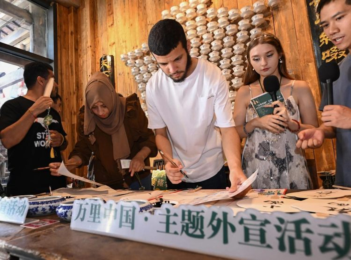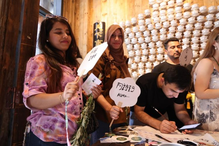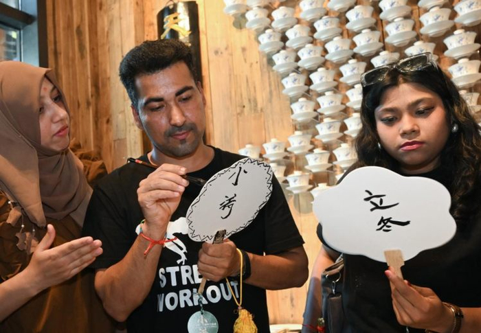 团扇工坊内,水墨的千年淡雅悄然流淌。端午画扇起源于唐宋,端午时节,天气开始渐热,扇子就成为端午节的节令事物之一。千百年来,人们在端午节这天,手持自画的团扇,腰挂香囊、结伴同行去观看赛龙船。留学生们屏息凝神,执笔在素白扇面上书写具有中国节气特色的中文名字,墨香在笔锋流转间氤氲开来。“写字时墨香萦绕,心特别宁静。”小孟沉浸在书香墨韵中。