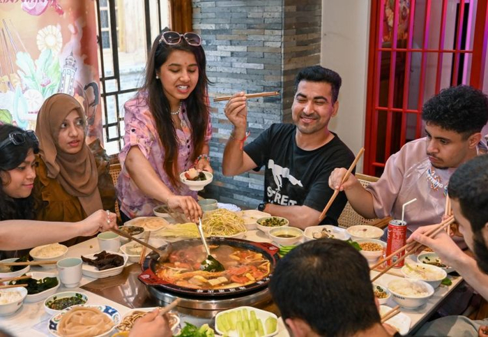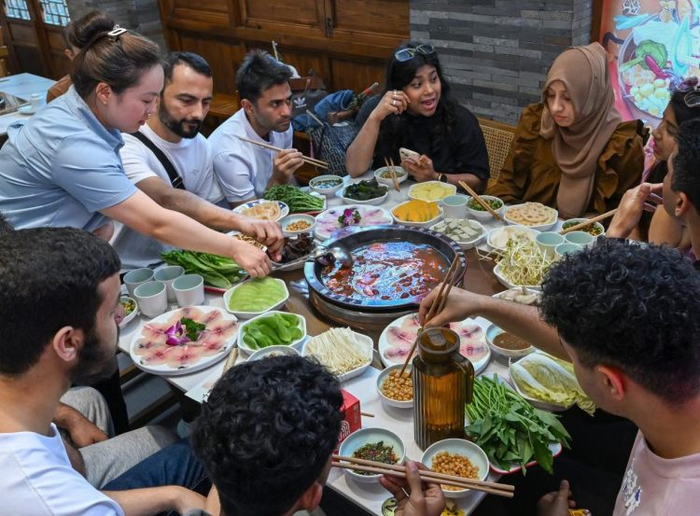 体验的高潮,由一阵浓烈奔放的牛油香气引领。循香步入洞子火锅馆,翻滚红汤中辣香、椒香、油香交融,瞬间引爆了所有人的味蕾。虽然火锅并非端午节特色餐饮,但已深刻入重庆人的饮食基因里。每到节假日,火锅是必须的。“太香了!辣得过瘾,越吃越香!”留学生们直呼痛快,在这份酣畅淋漓中感受着重庆饮食文化的热情与活力。