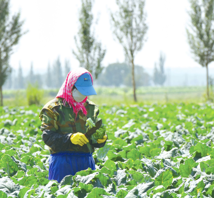 乌兰察布市兴和县冷凉蔬菜喜获丰收,村民正在地里采摘西兰花。