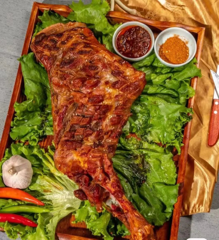 烤羊腿是从烤全羊演变而来,经过长期的发展,在羊腿烘烤过程中逐步增加了各种配料和调味品,被人们赞为"眼未见其物,香味已扑鼻"。