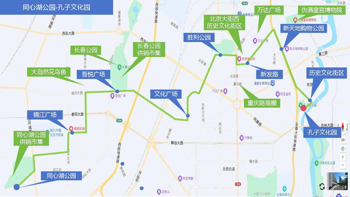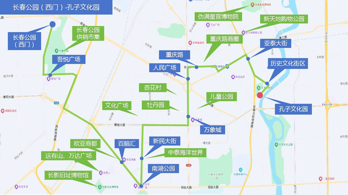 由长春公园西门始发,终到孔子文化园,途经:正阳街(长春公园)、皓月大路(吾悦广场)、普阳街、工农大路(红旗街商圈、长影旧址)、新民广场(南湖公园)、新民大街(历史文化街区、中泰海洋馆)、解放大路(文化广场)、人民大街(万象城、牡丹园、儿童公园)、重庆路(重庆路商圈)、大经路、长春大街、亚泰大街(新天地购物公园)、永长路(历史文化街区)东头道街(文庙)。线路全长15.1公里,运营时长约55分钟,票价5元,首末车时间9:00-16:00。