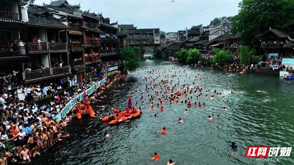 凤凰县举行端午赛龙舟抢鸭子活动,龙舟比赛与抢鸭子激情上演。