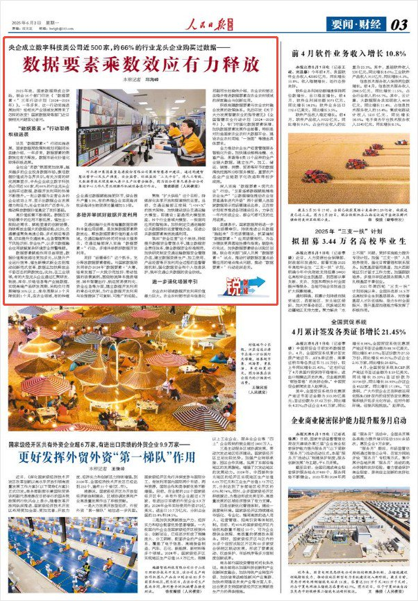 全社会“用数”氛围更加浓厚。越来越多的企业投身数据市场,激活数据价值成为各界共识。有关方面的研究测算显示,中央企业成立数字科技类公司近500家,约66%的行业龙头企业购买过数据,数据开发利用的热情不断提升。一批以数据为主营业务的企业成功上市,显示出数据企业发展潜力和活力。社会主体的广泛参与,为推动释放数据价值奠定了良好基础。