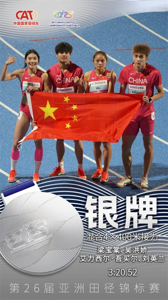 本次亚锦赛是继世界室内锦标赛、世界接力赛后对中国田径运动员而言又一次极佳的练兵机会。中国田径队共派出62名运动员参与43个项目的角逐,参赛项目数量和参赛人数规模均超往届。5月28日,在混合4×400米接力比赛中,中国田径队派出梁宝棠、吴洪娇、艾力西尔·吾买尔、刘英兰出战,最终四人合力跑出3:20.52,收获一枚宝贵的银牌。