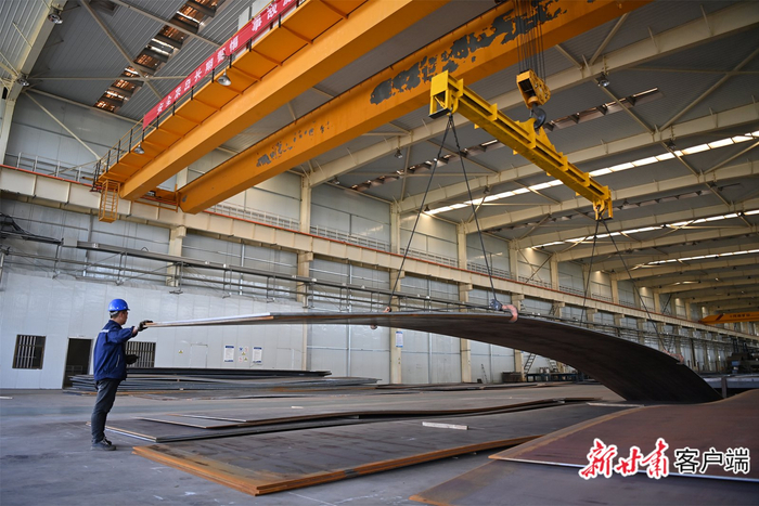 数十米长的钢板被重型行车吊运至切割台,精准分割成预设的弧形段;厚重的钢板被卷板机缓缓碾压,逐渐弯曲成直径数米的筒节;自动焊接机械臂沿着筒节接缝匀速移动,焊工们头戴防护面罩,手持焊枪修补细节部位。成型后的筒节像搭积木一般逐段对接。“五段筒节组焊成完整的塔筒。高度约有110米,重量有300多吨。”该公司生产经理王海飞介绍。