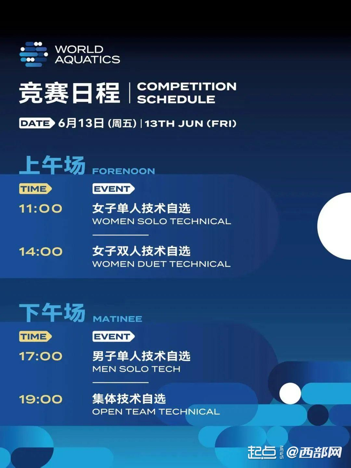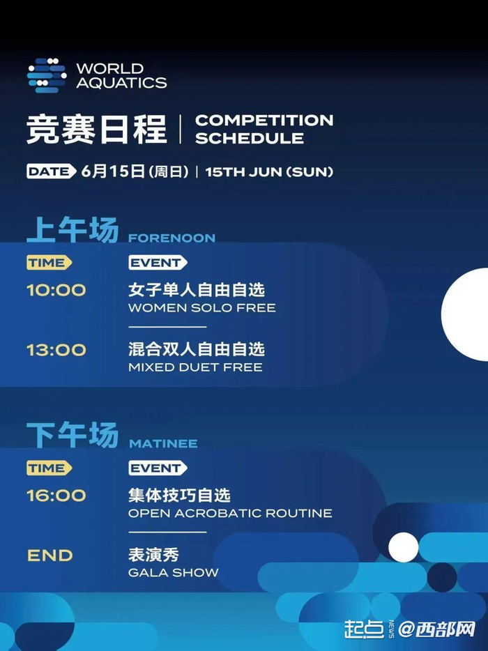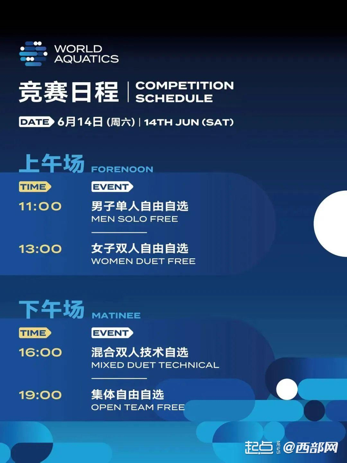 本次赛事由世界泳联主办,中国游泳协会、陕西省体育局、西安市人民政府承办。据悉,本次赛事将在13日上午进行女子单人技术自选,下午进行女子双人技术自选、男子单人技术自选、集体技术自选;14日上午进行男子单人自由自选,下午进行女子双人自由自选、混合双人技术自选、集体自由自选;15日上午进行女子单人自由自选,下午进行混合双人自由自选、集体技巧自选。