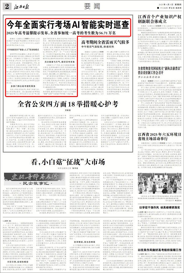 本报讯 (全媒体记者李芳) 6月4日,江西省2025年普通高考温馨提示新闻发布会召开。今年高考将于6月7日至9日举行,全省参加统考考生为56.71万名。