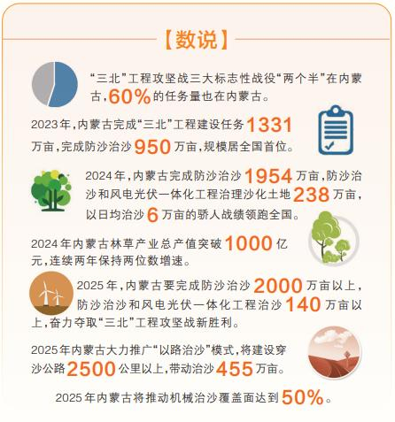2025年,“三北”工程攻坚战三大标志性战役进入第三年。2023年日均治沙4万亩,2024年日均治沙6万亩,2025年计划完成防沙治沙2000万亩以上,从“绿色长城”到“光伏长城”,内蒙古以滚石上山的劲头,持续用力久久为功,不断刷新防沙治沙新纪录、创造防沙治沙新奇迹。