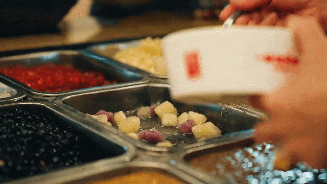 一碗冰饭没有固定的配料形式,芋圆、仙草、椰果、珍珠、红豆,还有各种水果都加入“战场”。糖水不再是汤底的唯一选择,椰浆、奶茶、杨枝甘露应有尽有,多重口感buff叠加,快乐升级。