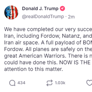 “我们非常成功地完成了对伊朗三处核设施的打击,包括福尔道、纳坦兹和伊斯法罕。所有(美军)飞机目前都已在伊朗领空之外。”特朗普在社交媒体上写道,“满载的炸弹投向首要设施——福尔道。所有飞机正在安全返航路上。”