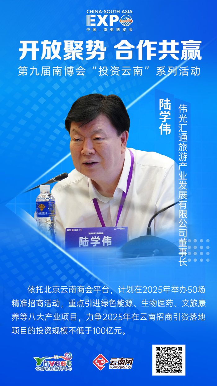 “家乡不断地刷新营商环境的‘速度’与‘温度’,让我们深刻体会到这片热土对企业、企业家的尊重和信赖。”陆学伟表示,将依托北京云南商会平台,在2025年举办50场精准招商活动,重点引进绿色能源、生物医药、文旅康养等八大产业项目,力争在云南招商引资落地项目投资规模不低于100亿元。