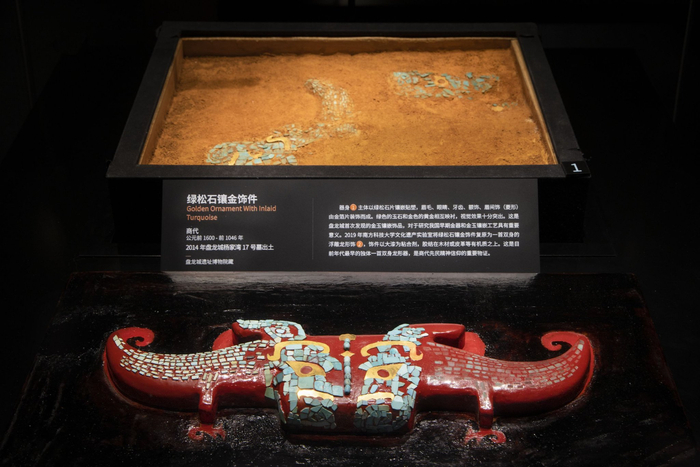 盘龙城遗址出土的绿松石镶金饰件。