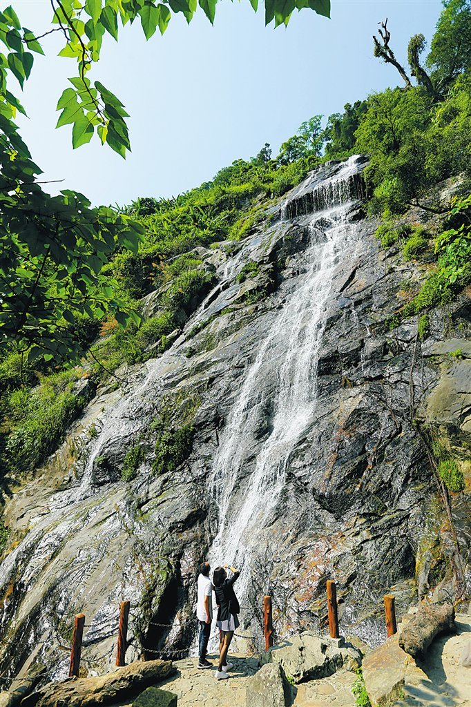 沿着林中的石子路拾级而上,大约百米就可见到姐妹瀑布。它的垂直落差有近50米,水从高处落下的姿态宛如“仙女下凡”,溅起的层层水花,与周围的茂盛树木、怪石嶙峋等,构成了一幅绮丽画卷。